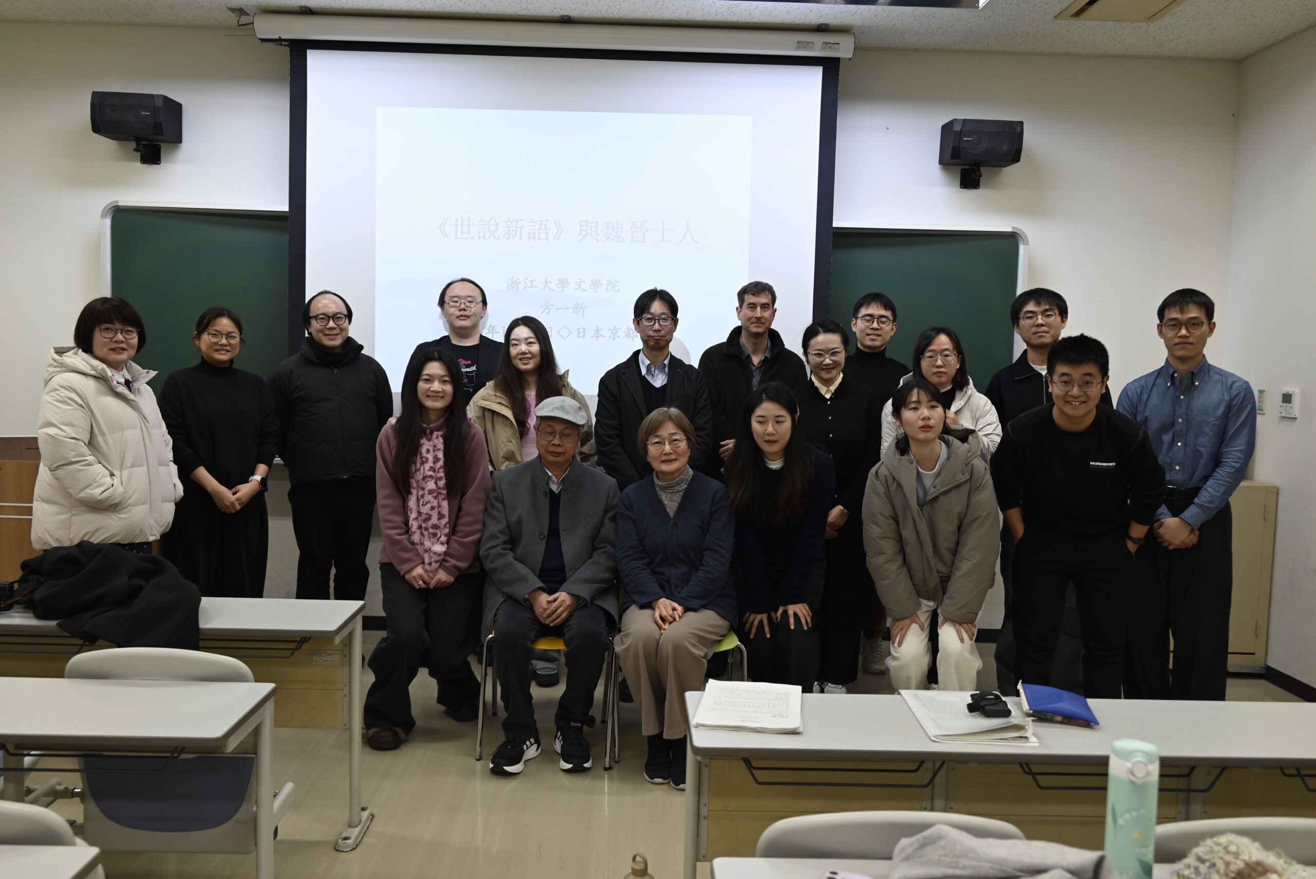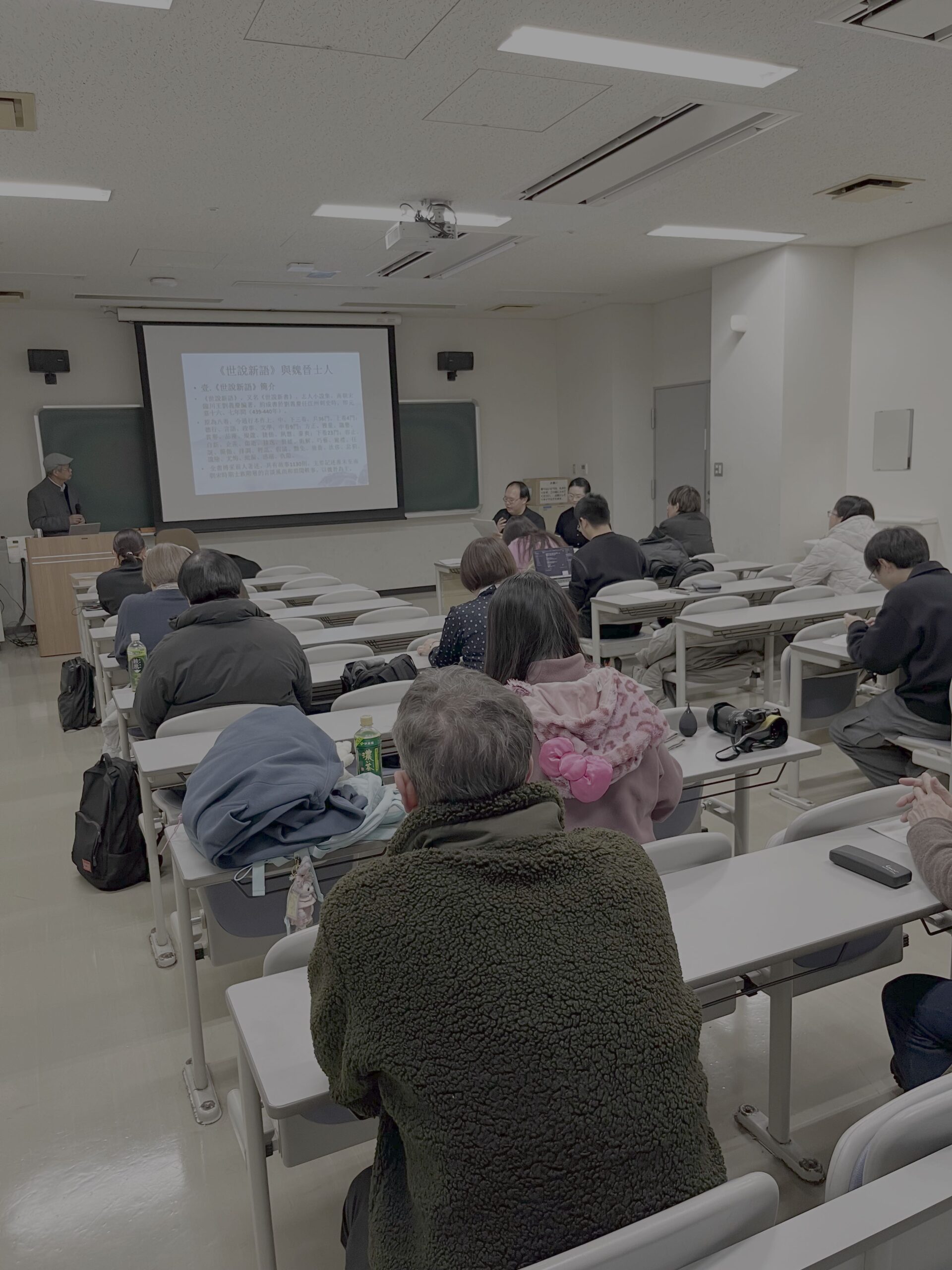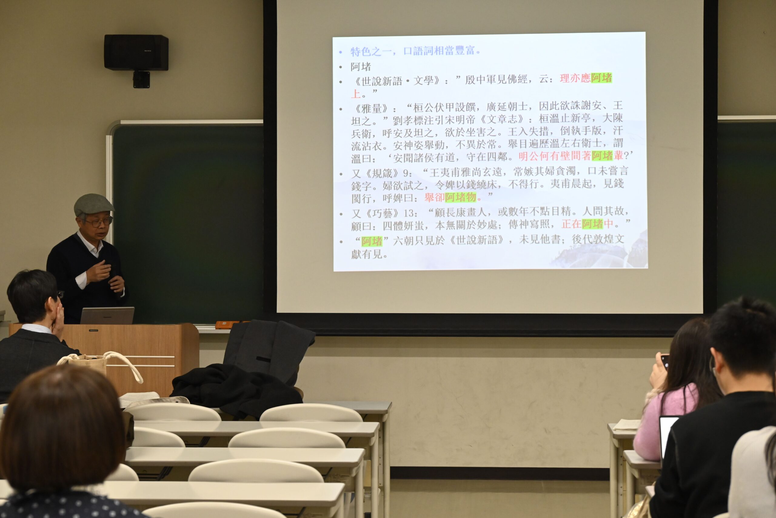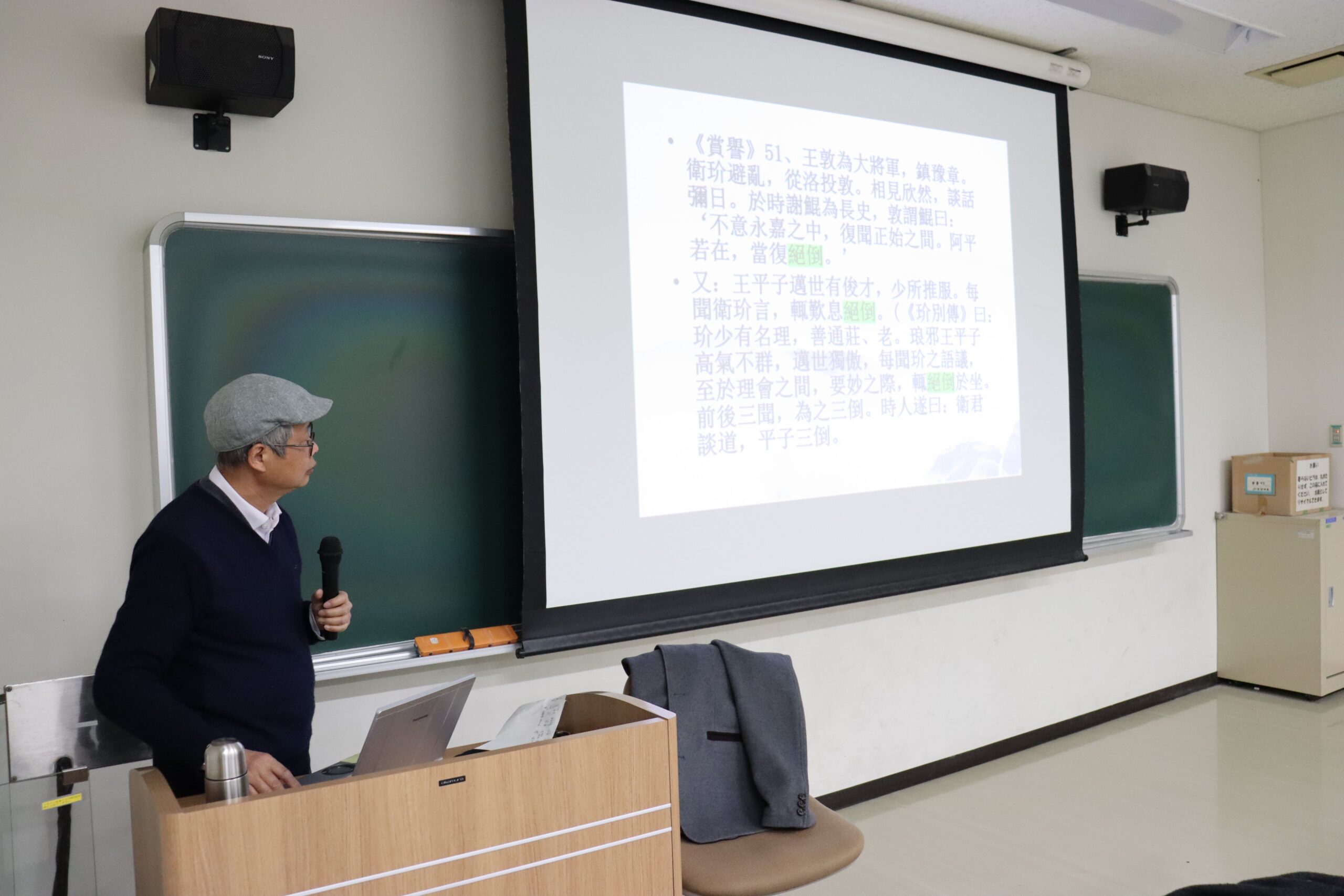 ご講演では、南朝宋代の劉義慶によって編纂された著名人・知識人にまつわる逸話集『世説新語』をとりあげ、文献的な概要を紹介した上で、言語面や内容面における特徴について、具体的な用例を引用しつつ解説をしていただきました。言語的特徴については、当時の口語語彙や漢訳仏典に由来する語彙、さらに江南方言を反映した語彙が多く含まれること、内容的特徴については、「清談を好む」「言語表現に長けている」「子供に才知がある」「容姿や振る舞いに魅力がある」といったユニークな観点からの生き生きとした描写がみられることが紹介されました。その上で、言語面・内容面における特徴を結び付けつつ、『世説新語』が口語的表現とユーモアとにあふれる「魏晋文人の百科全書」と呼ぶにふさわしい文献であるという総括がなされました。