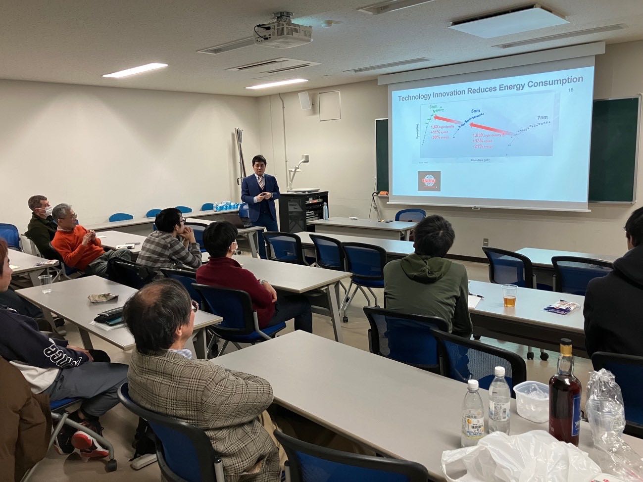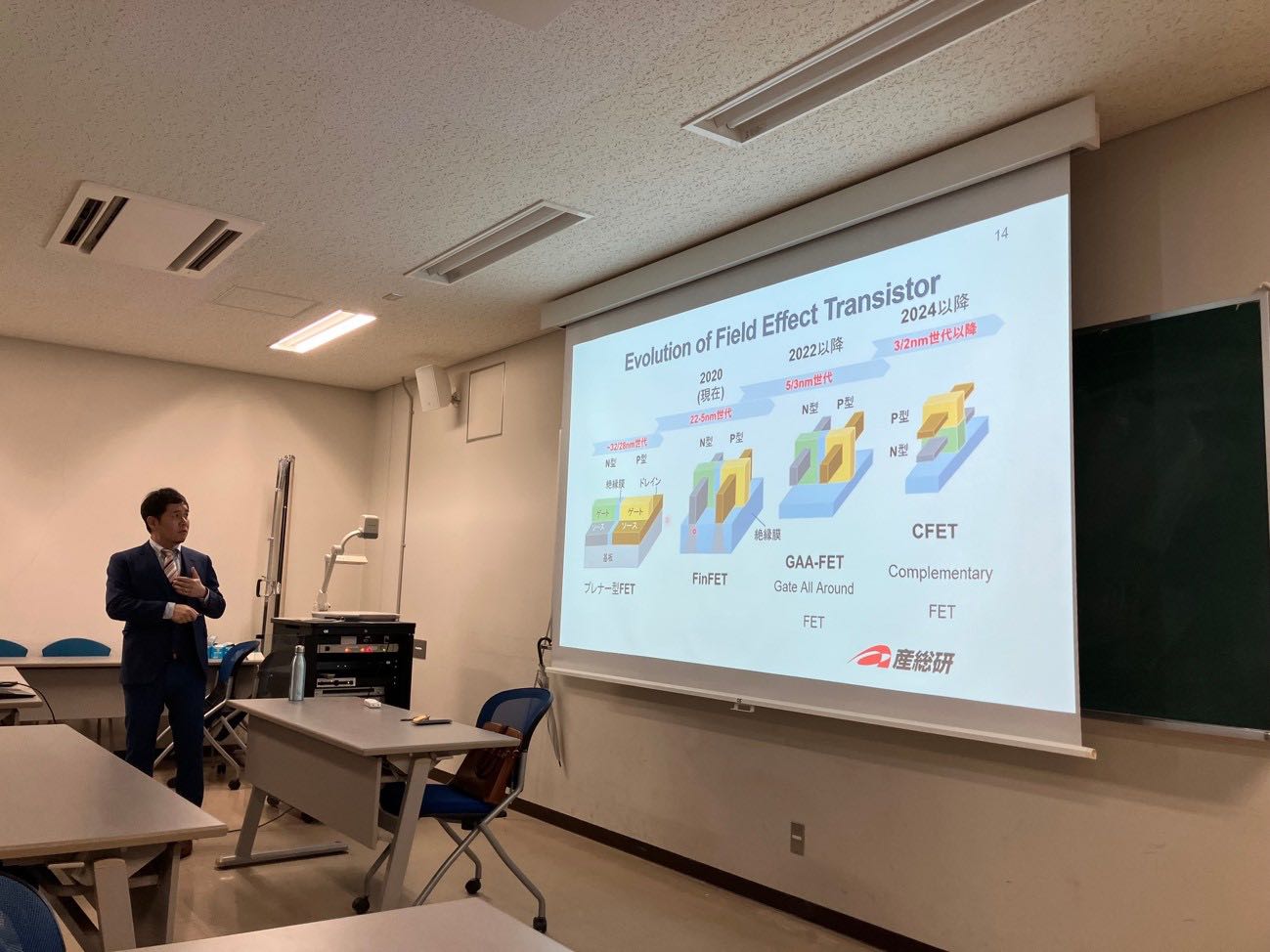 ご講演では、2次元半導体材料と金属電極の界面における構造や相互作用に関するご研究の成果をご紹介いただきました。現代社会において欠かすことのできない半導体デバイスでは、一つ一つの素子のサイズがナノメートルスケールにまで微細化され、加工技術や動作性能の限界に近付きつつあります。こうした限界を打破する方策の一つとして、主要材料であるシリコンを2次元原子層材料で置き換えることが注目されています。ご講演では、このような半導体デバイス産業におけるトレンドを概観していただいた後に、有力な原子層材料である遷移金属カルコゲナイドの構造や物性、及び金属電極との接合界面に関する電気的特性などについて研究事例を説明していただくとともに、今後の展望を示していただきました。